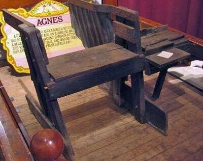 Wooden glassblower's chair with blowing pole and three tongs.