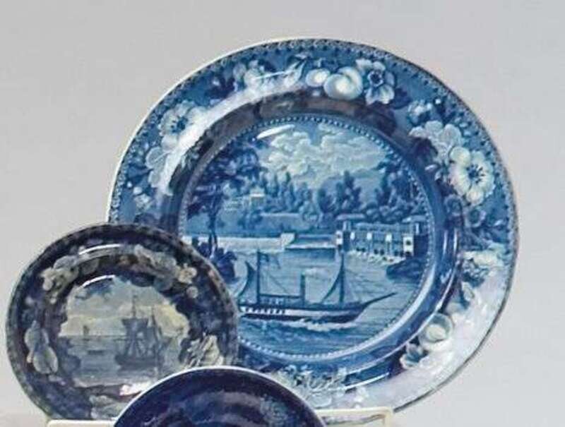 Including plate with "The Dam and Water Works, Philadelphia," with printed paper label of Alfred Bullard, London, and small plate, with mark of Enoch Wood with the "Cadmus". Smaller plate darkened, hairline, crazed.