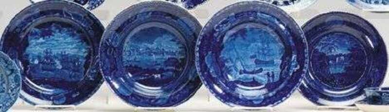 Including two plates printed with "Gilpin's Mill of the Brandywine Creek," "Commodore MacDonough's Victory," and two soup plates printed with "City of Albany State of New York," and "Cadmus." some glaze imperfections.