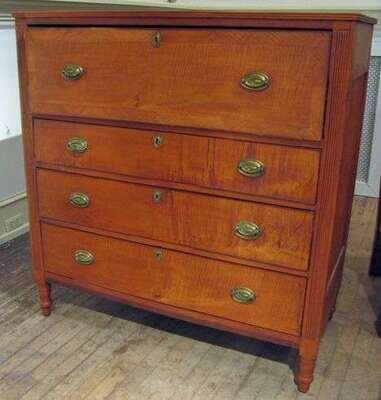Rectangular top with cockbeaded secretarial drawer above three graduated cockbeaded wide drawers, flat reeded corners, recessed paneled sides on turned feet, interior with cubbyholes, small drawers and door. Some warpage.