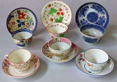 Including five teabowls and saucers variously decorated, one in Gaudy Dutch "Single Rose" pattern, one in "King's Rose," one "Strawberry," one in a sprig motif, and a chinese export example in blue "Fitzhugh, and a handled cup in a stylized floral pattern.