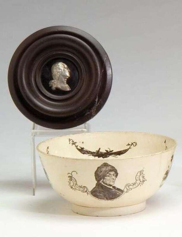 The bowl transfer-printed in black with bust-length portraits of Benjamin Franklin and George Washington and pastoral scenes, the interior with three-masted ship flying American flag, with trophies under rim; together with a cast silver profile of George Washington mounted on a black velvet ground within a circular molded mahogany frame. Losses , chips and old repairs to bowl, frame cracked.