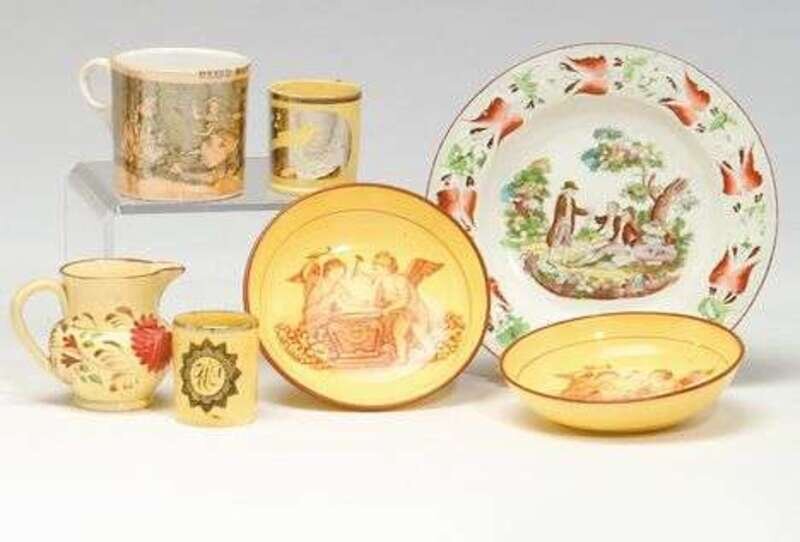Including pair of canary yellow saucers tranfer-printed with puti with anvil, marked "Sewell," two small canary yellow mugs, one decorated with silver lustre, the other transfer-printed in black with a "W," a small yellow creamer decorated with flowers, transferprinted lustre children's mug and a molded, transfer-printed and painted plate. repairs, imperfections.
