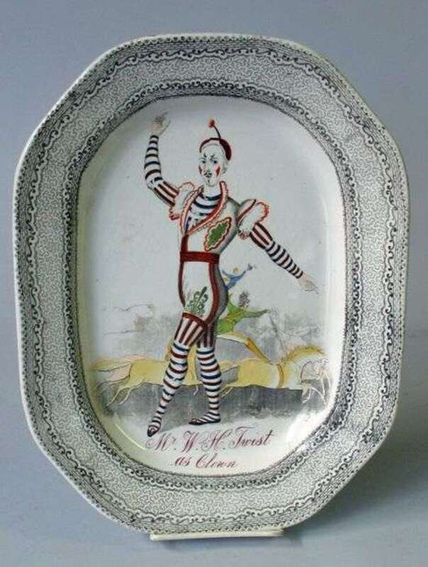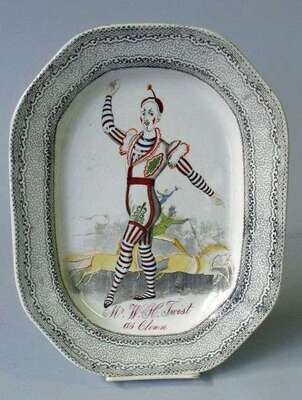 Of octagonal form decorated with a circus scene and the figure of "Mr. W.H.Twist as Clown." Some enamel loss, crack.