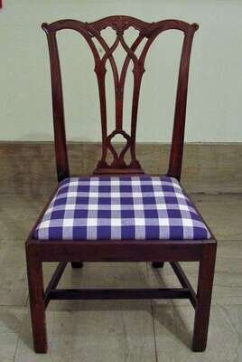 The serpentine crest rail carved with leafage above pierced interlaced splat and molded stiles raised on trapezoidal seat , squared and molded legs.