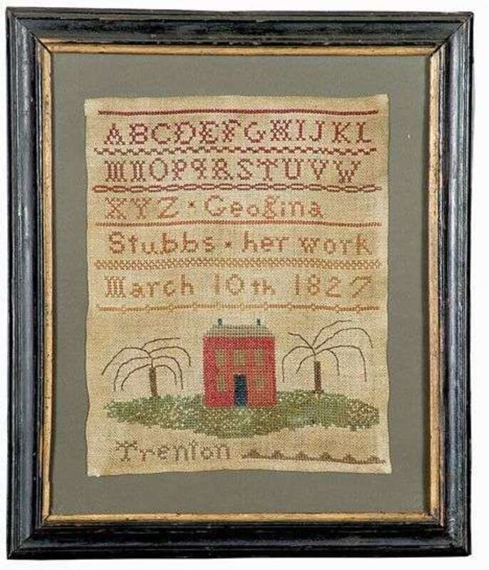 Alphabet and inscription "Geogina Stubbs her work March 10 1827" above panel with a house flanked by trees and "Trenton" worked with wool yarns on a linen ground, framed. 9 3/4 in. x 7 3/4 in.