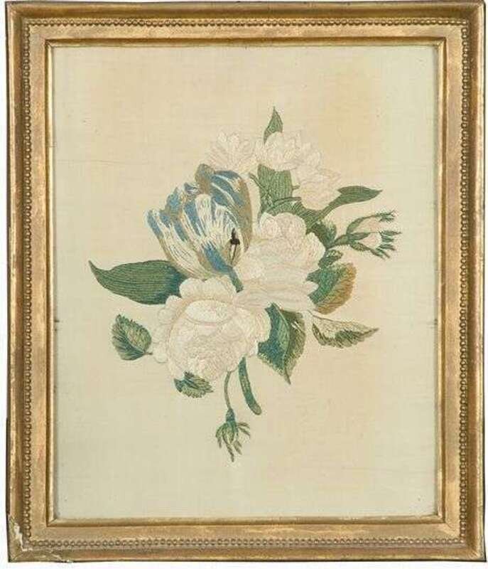 A spray of flowers worked in silk threads in shades on yellow, blue, green and white on a silk ground, framed, some fading.