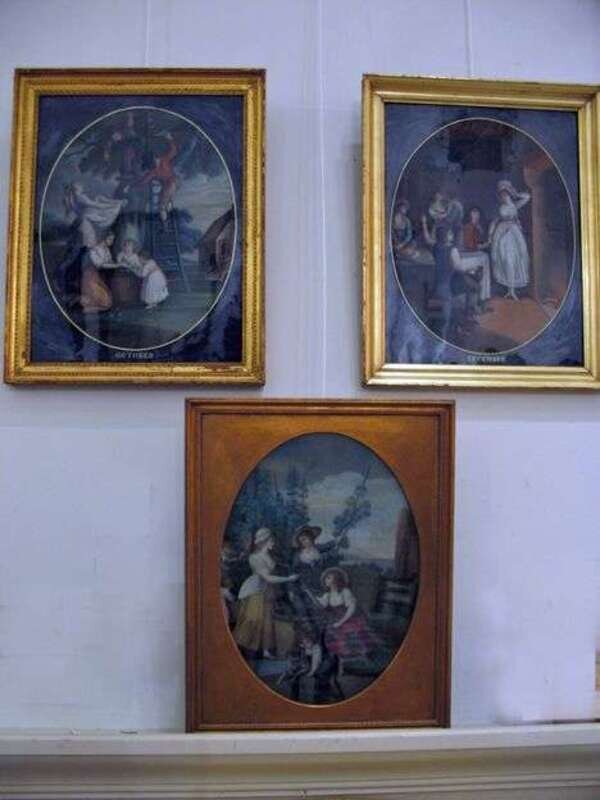 The months September, October and December illustrated with bucholic scenes within an oval reserve, framed. One cracked. One frame bers printed paper label of Frederick C. Garbanati, Philadelphia frame and looking glass manufacturer.