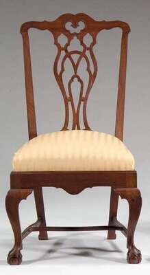 Serpentine crest rail above pierced splat and molded trapezoidal seat , cabriole legs ending in ball and claw feet, flattened, shaped stretchers.