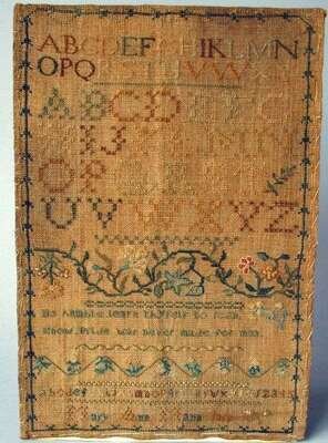 Worked with rows of alphabet above flowering vine and a virtuous verse, inscription and decorative bands below, polychrome silk threads on linen ground, unframed. fading, discoloration.