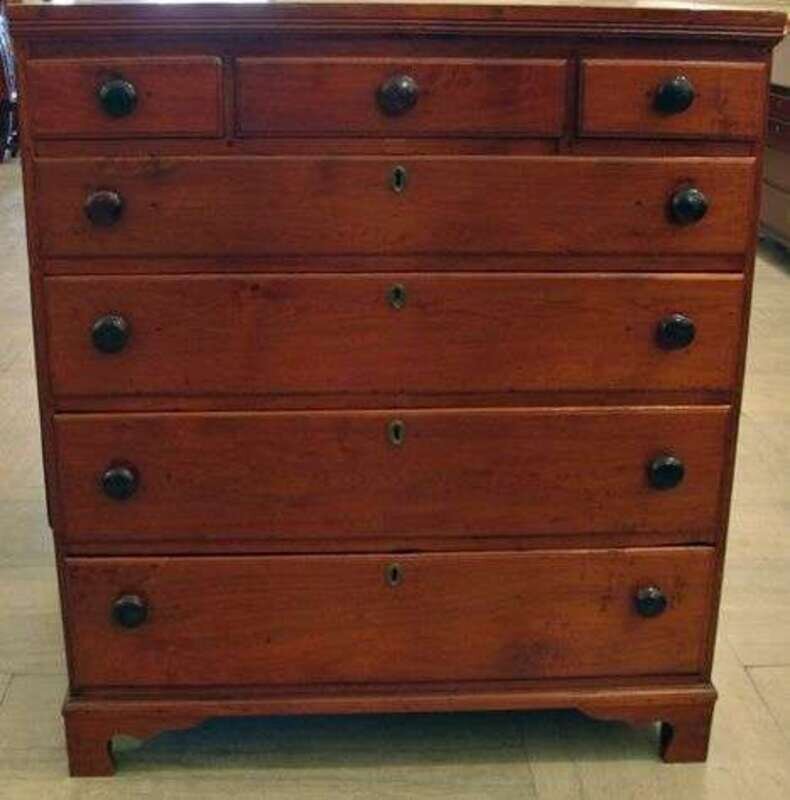 Rectangular molded top above three small and four graduated wide lip molded drawers, turned wood pulls, straight bracket feet.