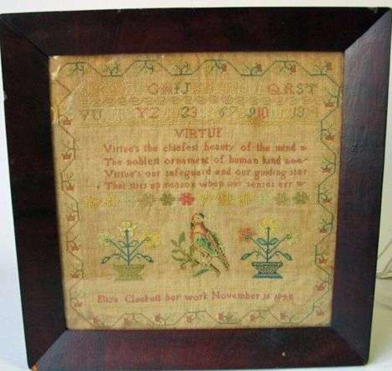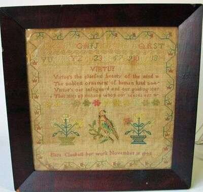 A flowering vine enclosing alphabet, verse, floral band and panel with exotic bird flanked by pots of flowers, the inscription below, worked in polychrome silk threads on a linen ground, framed. 16 in. x 16 in. some fading and discoloration.