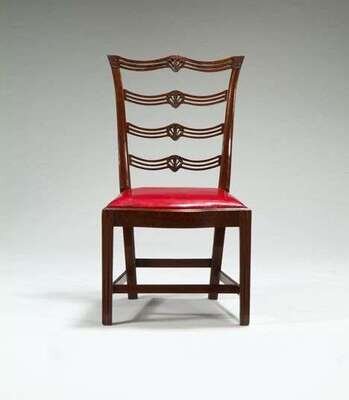 Having four pierced splats with center carved plume ornament, carved foliate device at top of stiles, serpentine front slip seat, molded chamfered legs with H stretcher. Old repair, refininshed.