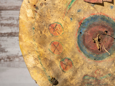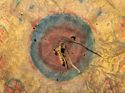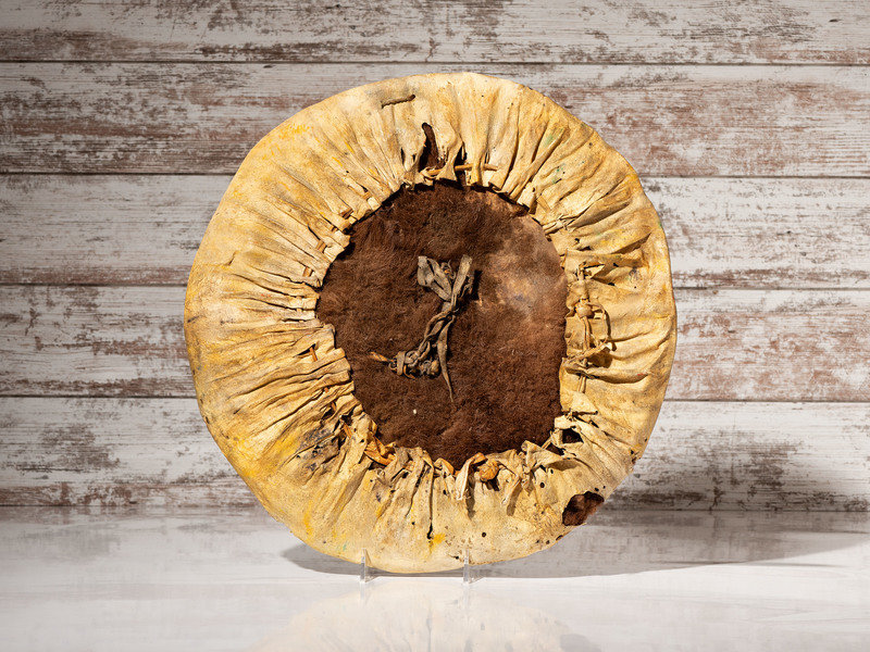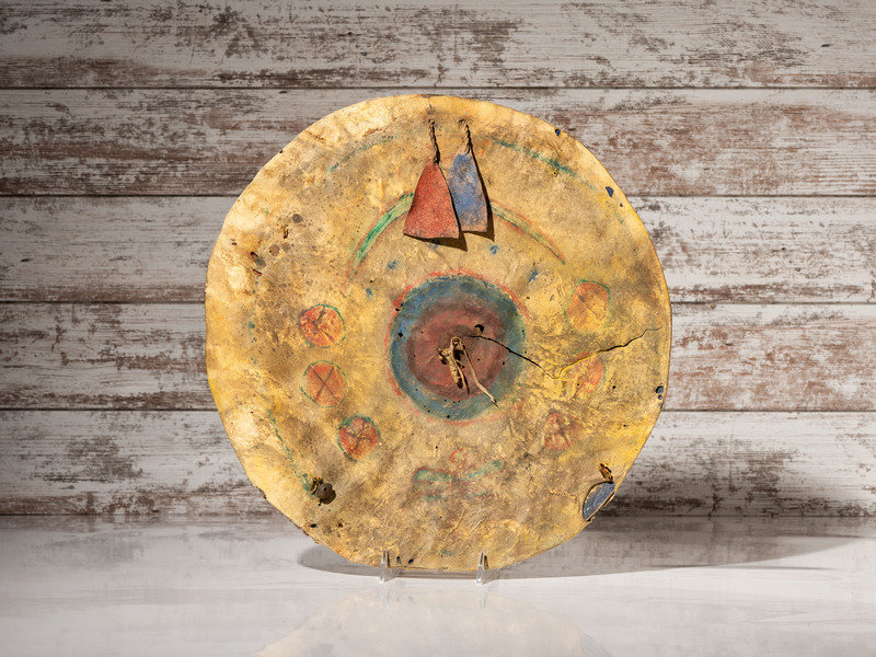 buffalo hide shield is tightly fastened within the cover; shield is brightly painted in blue, red, and yellow pigments through small tears in the hide