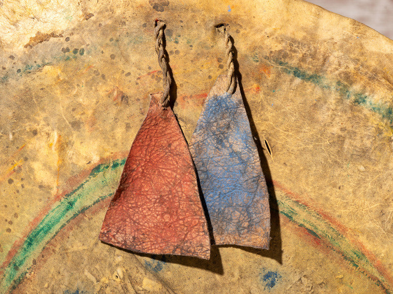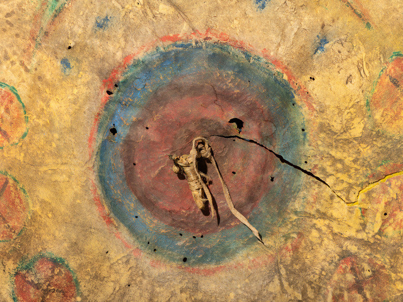 cover made of thin hide and painted with imagery of the sun, crescent moon, a series of six crossed spheres, and dragonfly; two triangular drops, crafted from buffalo hide are painted in blue and red pigments; additional hawk bell embellishment