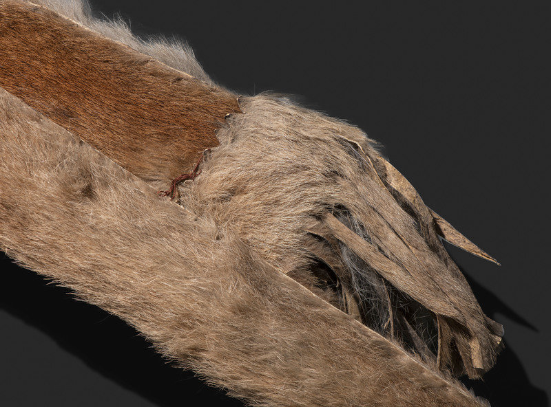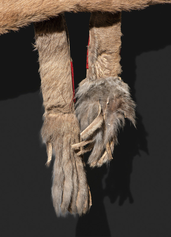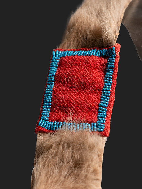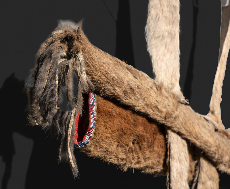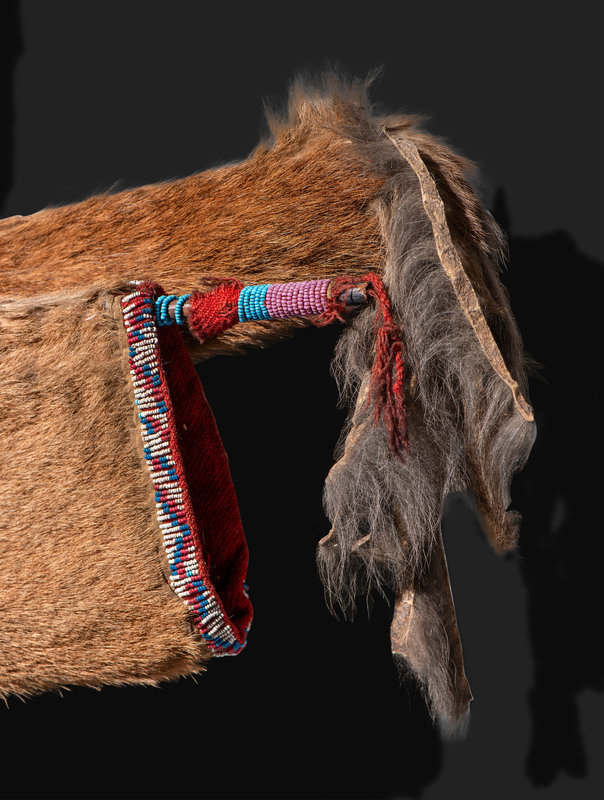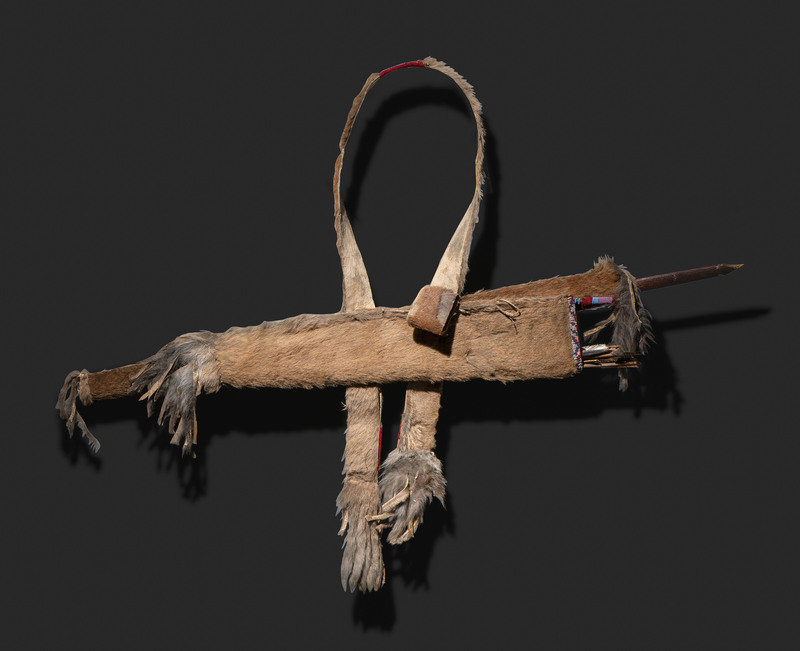 thread and sinew-sewn bowcase and quiver, having fringed end caps; lightly beaded with lanes on the quiver opening and accenting red wool decorations on the strap; overall length 40 inches