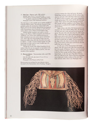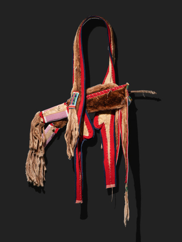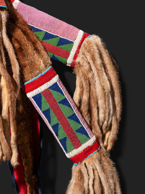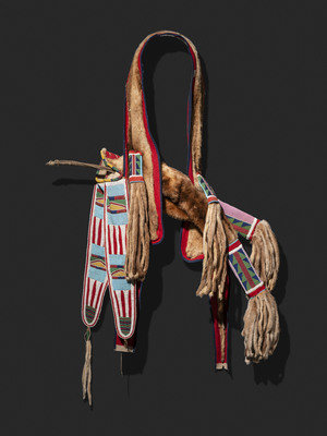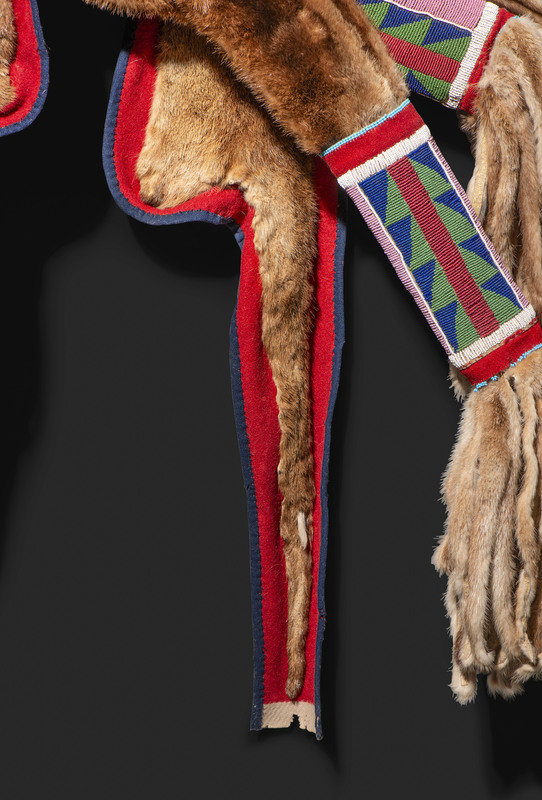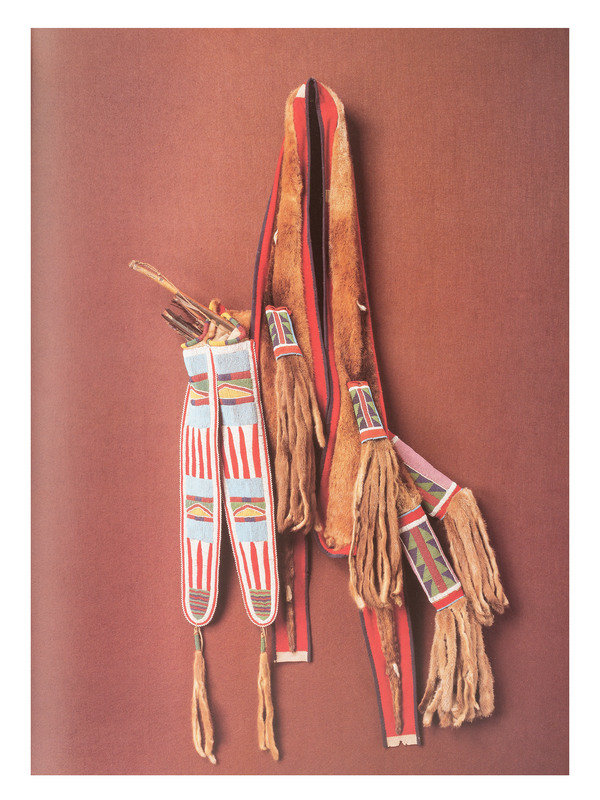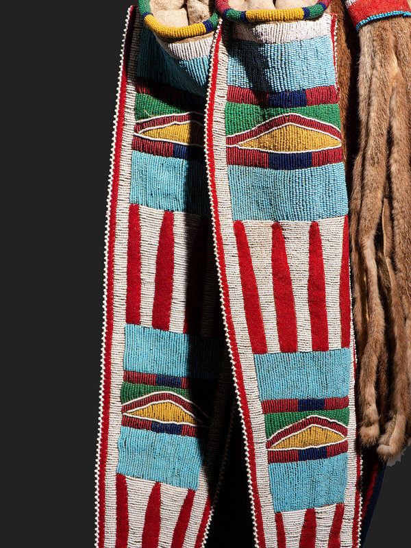 Made of three otterskins, this bowcase-quiver is constructed in the classic fashion (Holm 1981). Two otter skins are each sewn into a tube and used for the bowcase and quiver. The tails of the otter skins form the solidly beaded flaps. A third otter skin is split in half lengthwise and the halves are sewn end-to-end to form the strap (bandoleer). Where the bowcase and quiver are attached to the strap, decorative beaded tabs are added. The fur trimmed from the edges of the otter skins is cut into strips and used for the fringe at the bottoms of the quiver and bowcase and at the ends of the tabs on the straps.