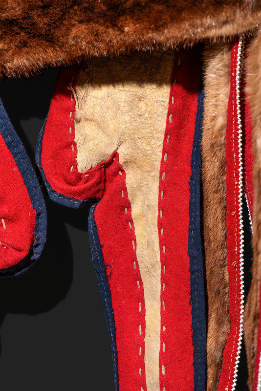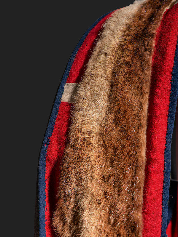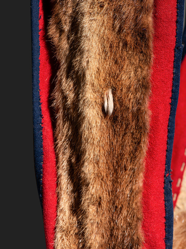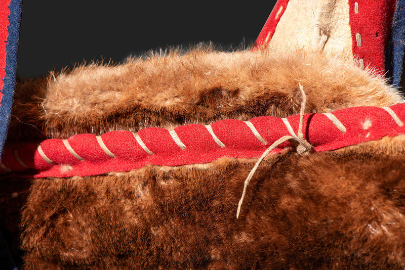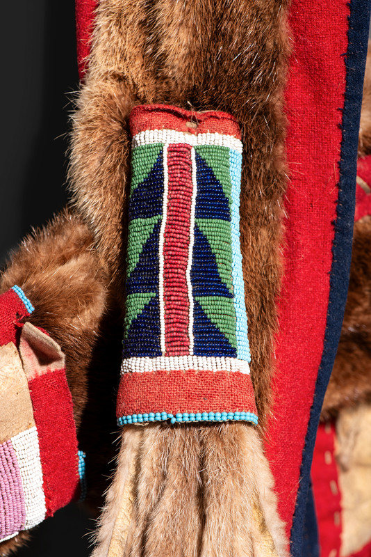thread and sinew-sewn; red trade wool strap is inset with otter fur and edged with navy wool; triangular tab drops and cuffs are beaded using colors of light blue, greasy yellow, pink, red white-heart, pea green, dark blue, and white; thin strips of otter fur fringe elegantly hang from each side of the strap and the endcaps of the bowcase and quiver