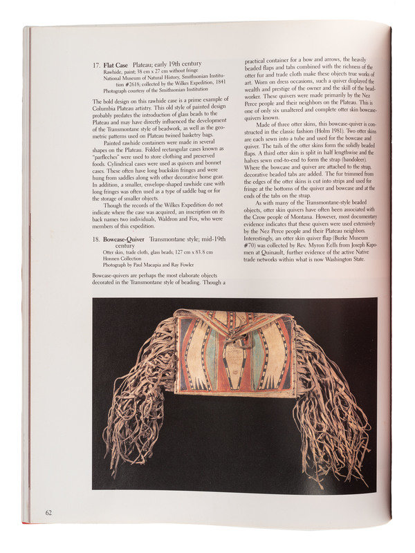 As with many of the Transmontane-style beaded objects, otter skin quivers have often been associated with the Crow people of Montana. However, most documentary evidence indicates that these quivers were used extensively by the Nez Perce people and their Plateau neighbors. Interestingly, an otter skin quiver flap (Burke Museum #70) was collected by Rev. Myron Eells from Joseph Kapomen at Quinault, further evidence of the active Native trade networks within what is now Washington State (Wright 1991: 62).