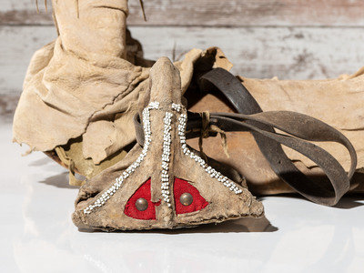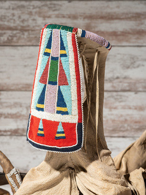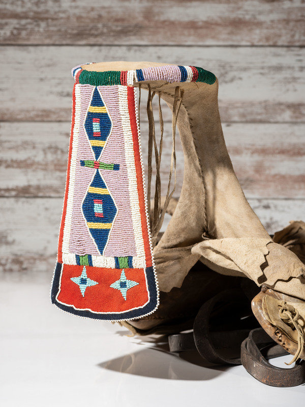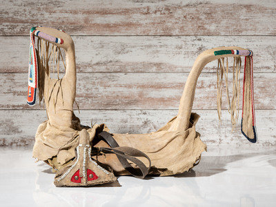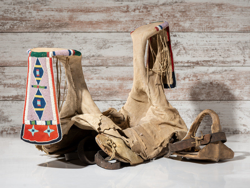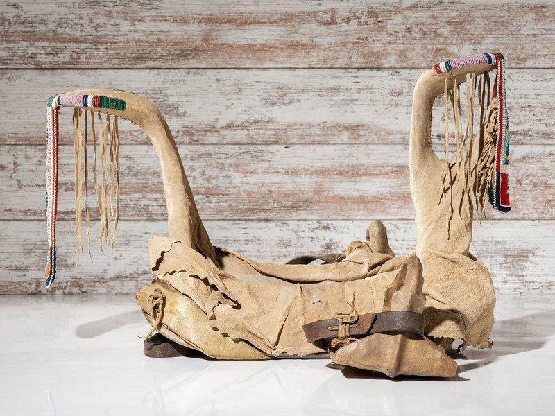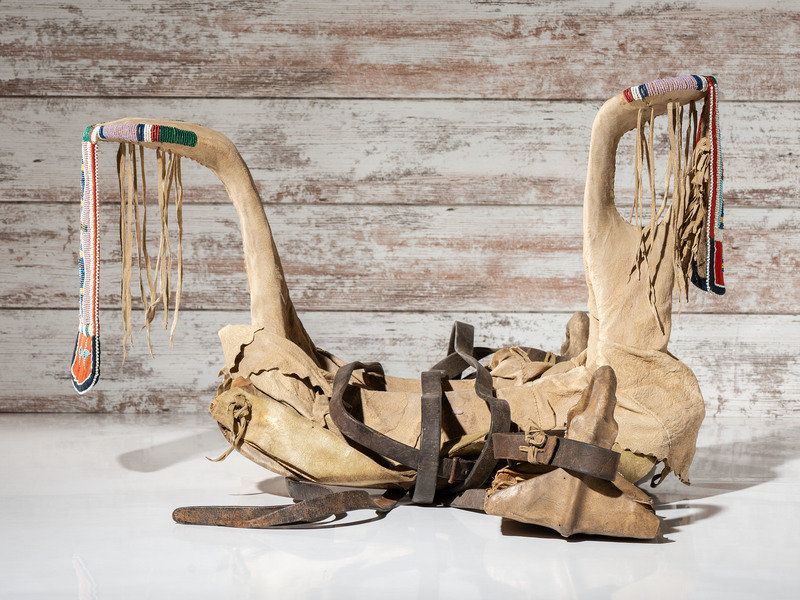 wood saddle tree wrapped with rawhide and covered with hide; buffalo hide drops are edged using navy and red trade wool and beaded in a geometric design; harness leather attach decorated wood stirrups