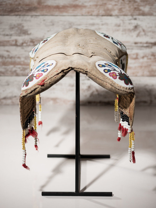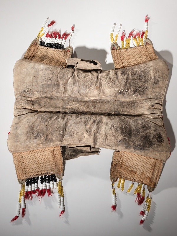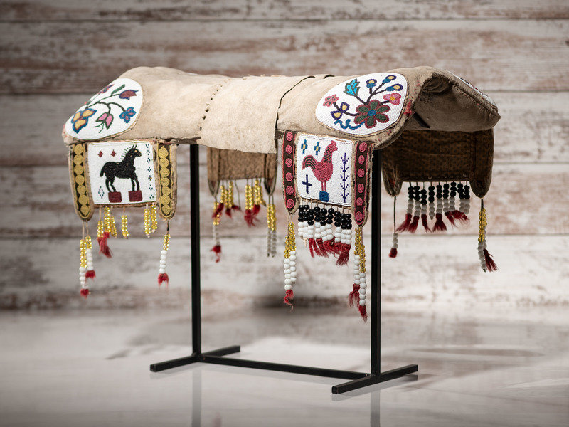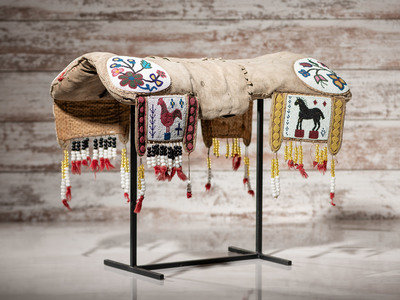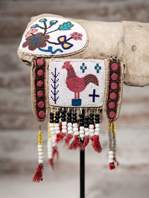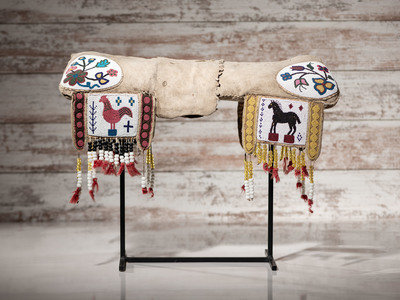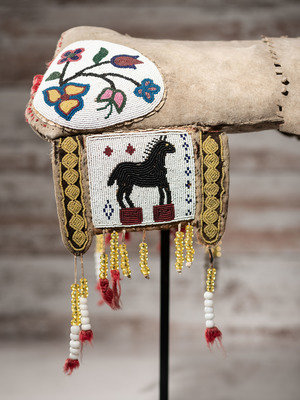 [This saddle]... is a "so-called" pillow saddle (no hole in the middle) with very unusual beadwork. Produced by the Cree or Blood/Piegan, c1870-1880, the four roundels at the corners of the buffalo-hide pillow are floral-patterned seed beads, and the four drops are pictorially-beaded images of a horse and a rooster. Crow beads and yarn were used for the fringes. Given the blocks or platforms upon which these animals stand, one is tempted to speculate that the beadworker was inspired by a traveling carnival that had a carousel (the time-frame would be appropriate). This pad saddle, unlike those of pre-1850 production, seems suited to parade and other festive occasions (Sage 2012L 29).