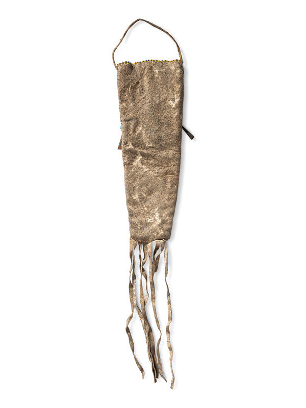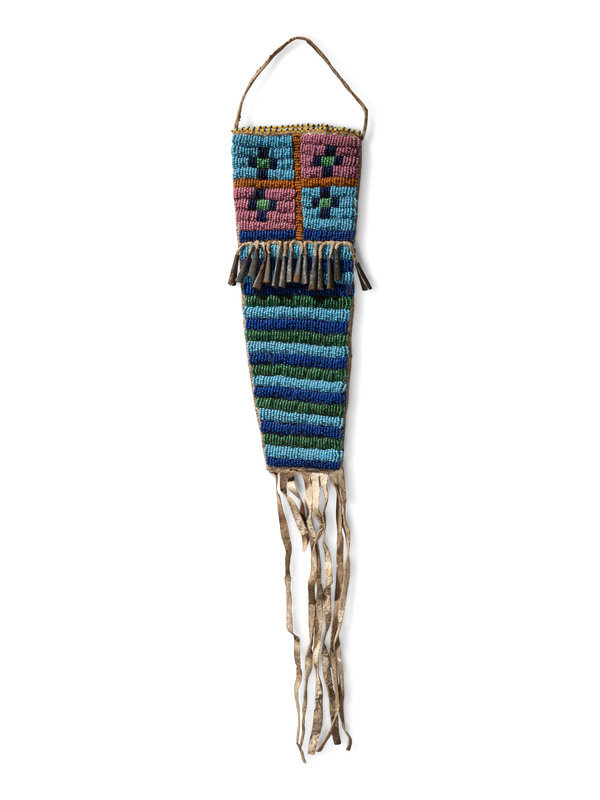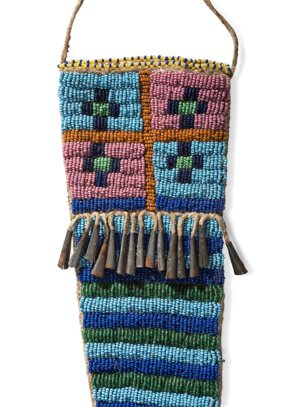 thread-sewn and beaded using colors of light blue, medium blue, pink, pumpkin, pea green, and translucent green; tin cone fringe; muslin lined