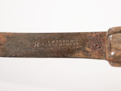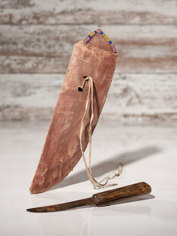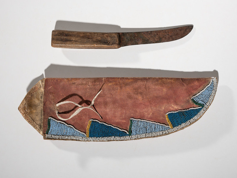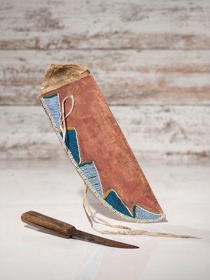 sinew-sewn and beaded in colors of light blue, greasy blue, white, and greasy yellow; surface of parfleche coated in red pigment; included is a heaving resharpened I. Wilson knife