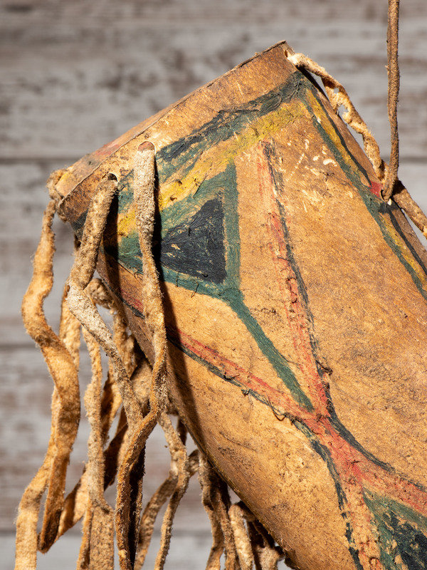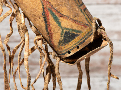colorfully painted geometric designs; buffalo hide thong and fringe; with collection tag BLACKFOOT MONT. KEN.