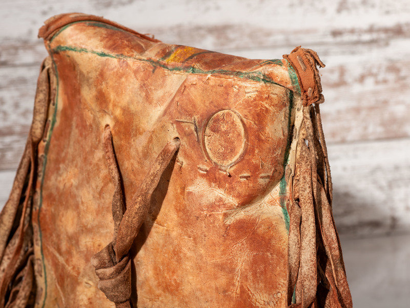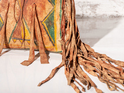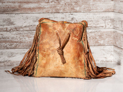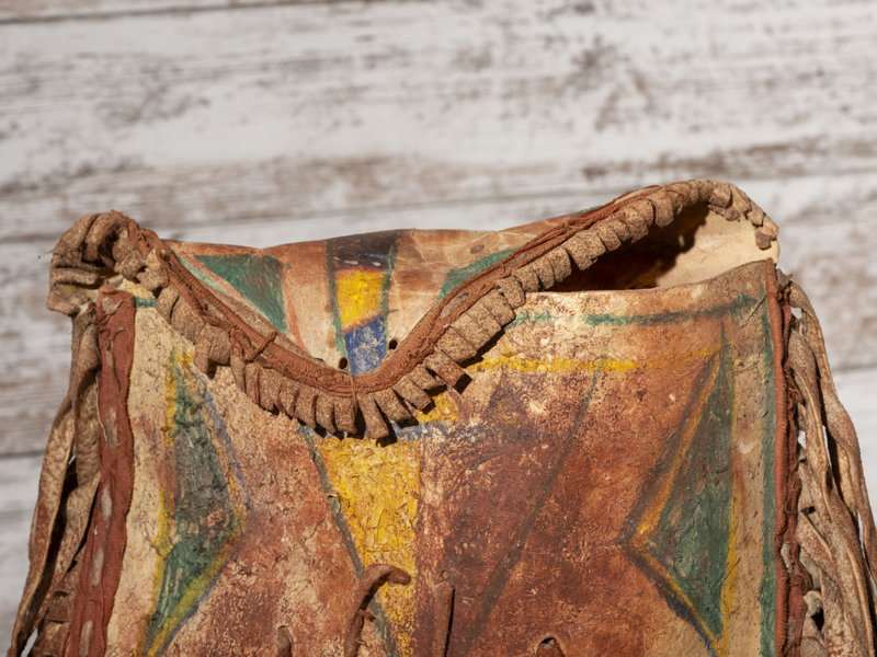 a parfleche envelope with painted geometric designs and long buffalo hide fringe; envelope length (excludes fringe) 14 inches x width 13 inches