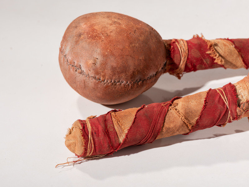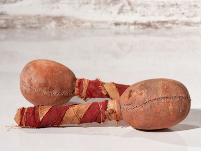 a pair of scrotum rattles coated in red pigment; handles wrapped with cotton cloth; length 10 inches x width 3-3/4 inches and length 10-1/2 inches x width 4 inches