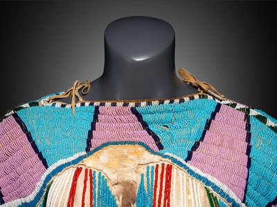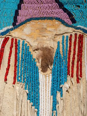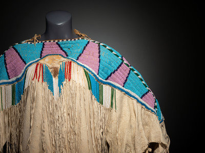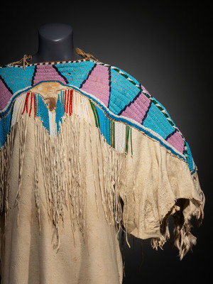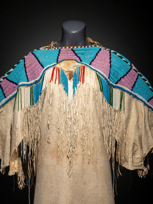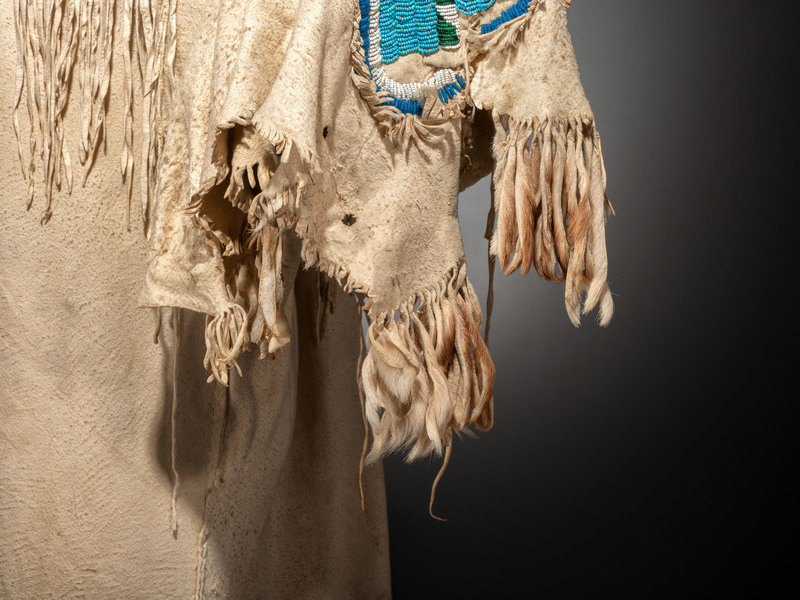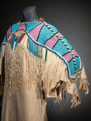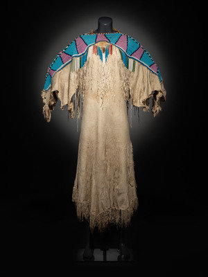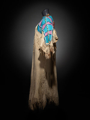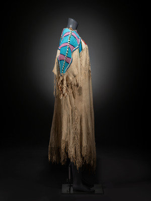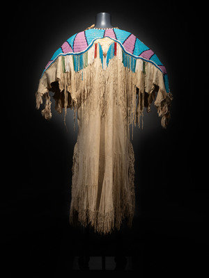 thread and sinew-sewn softly tanned hide; yoke beaded with a geometric pattern in colors of light blue, pink, white, translucent green, cobalt, and pony trader blue; hide fringe enhances seams; fringe along bustline detailed with accents of real beads