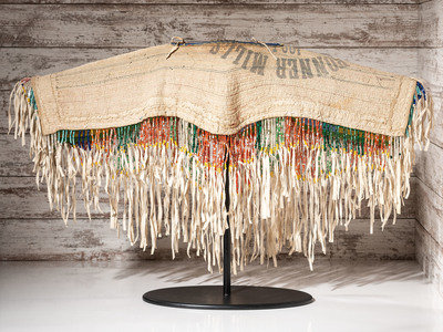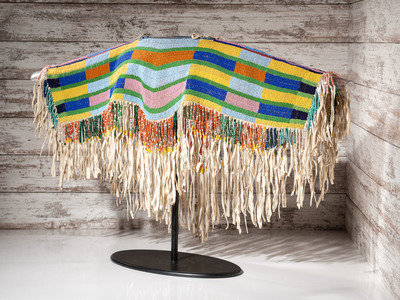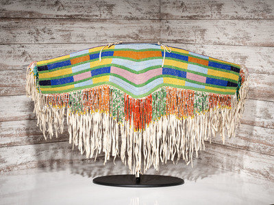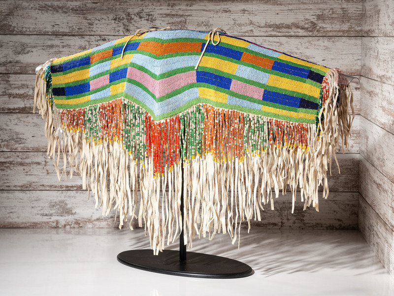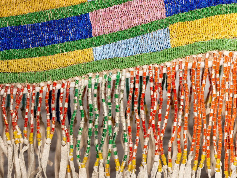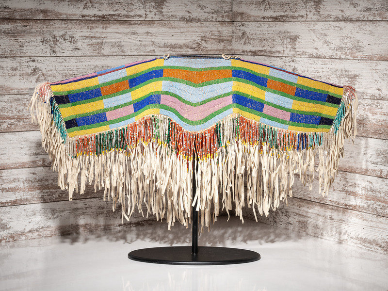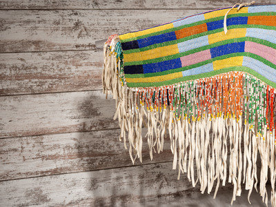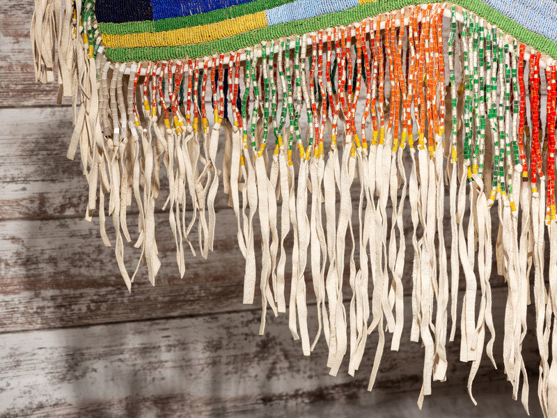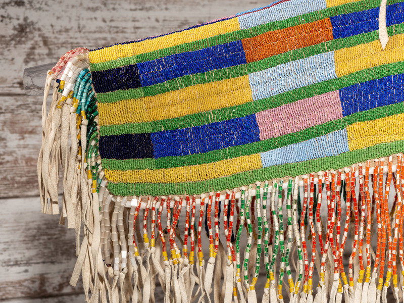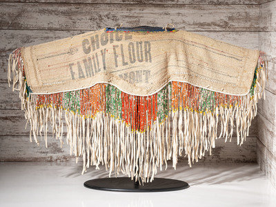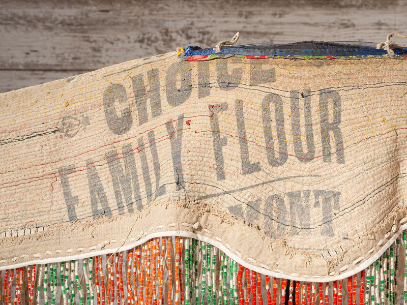 thread-sewn Bonner Mills 100lb Choice Family Flour, MONT. canvas and beaded using colors of light and dark blue, pink, pea green, yellow, rose, and pumpkin; hide fringe is threaded with translucent basket beads