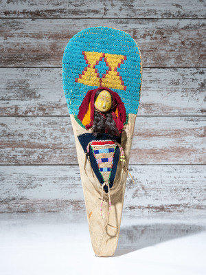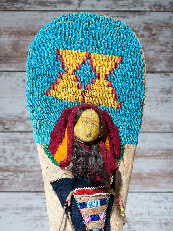thread-sewn and beaded using colors of light blue, red white-heart, and red white-heart; cradle holds a hide doll with its face painted in yellow and red pigments; braided hair