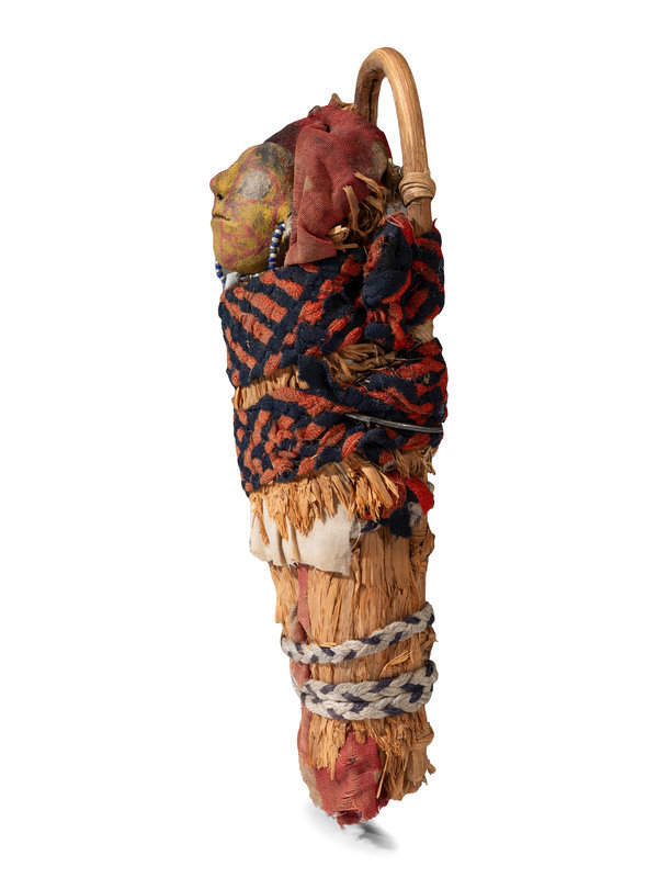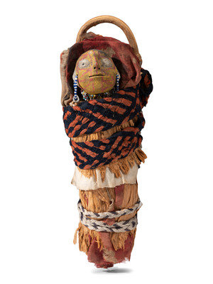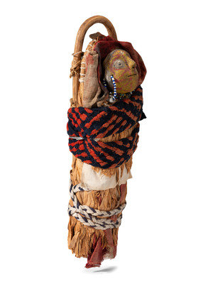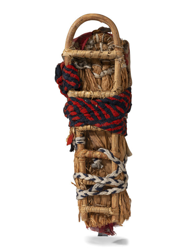 full-size doll painted in white, yellow, and red; tightly wrapped in a cradle with fiber and secured with braided wool strap