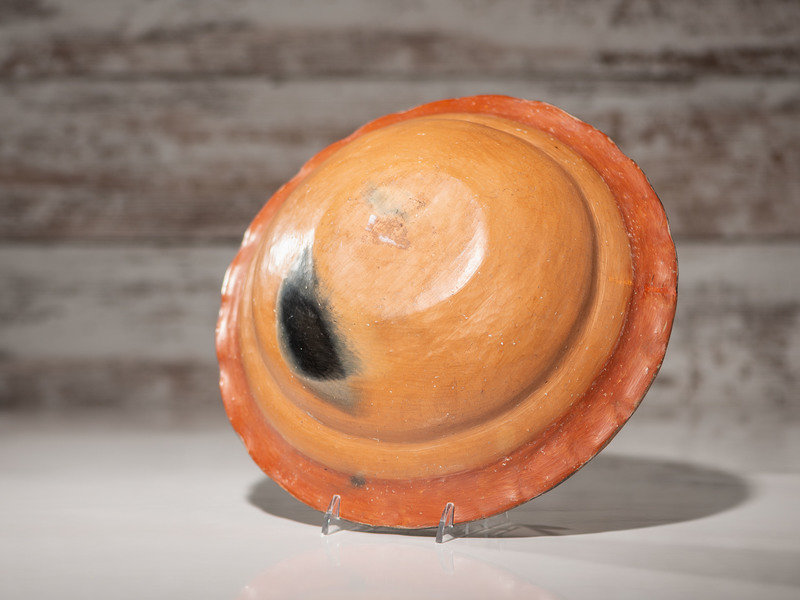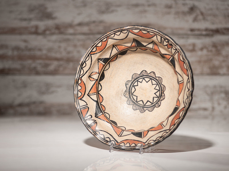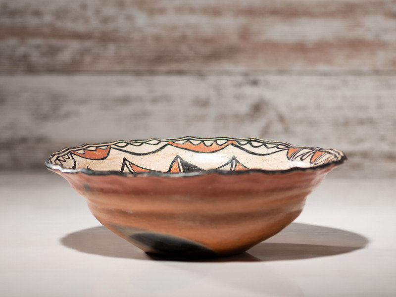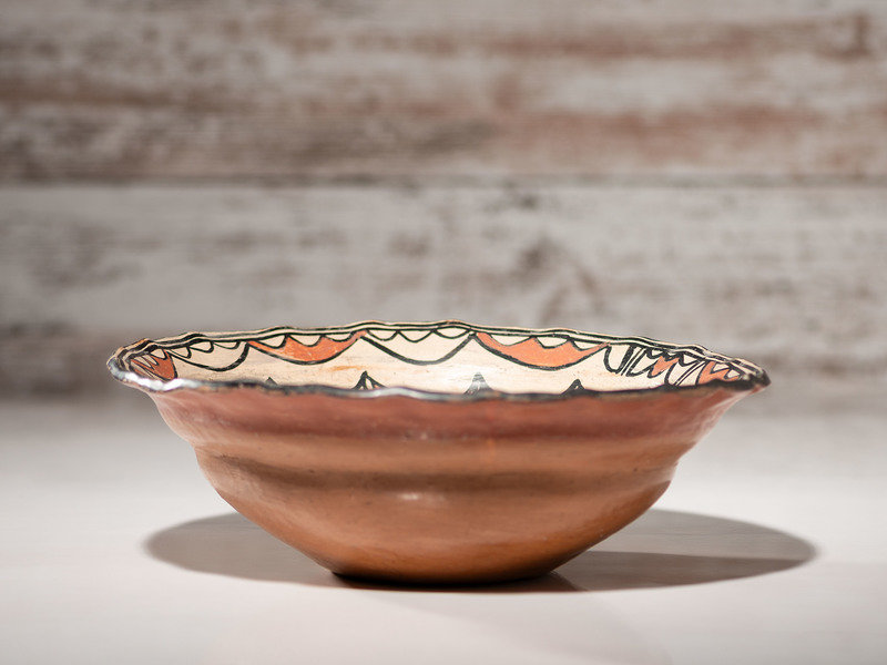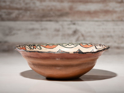 painted with bands of triangles and connecting winged elements enhancing the scalloped rim and slightly lobed body
