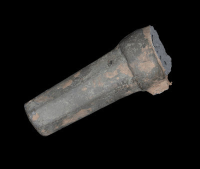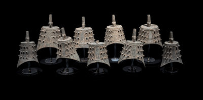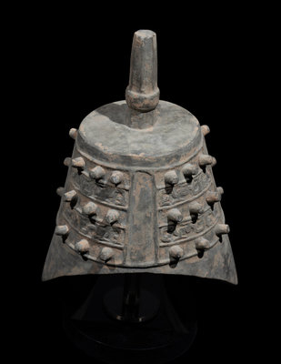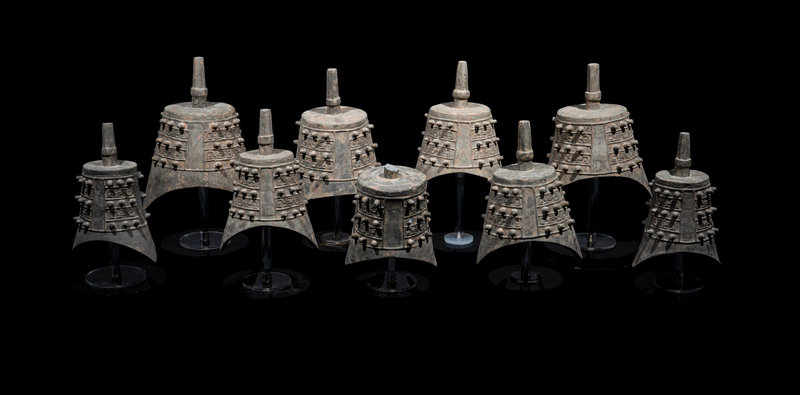 of various sizes, both sides of each bell rising up in an arc, decorated with rows of raised bosses divided by horizontal bands, the flat top surmounted by a lug for suspension, supported on a later stand.