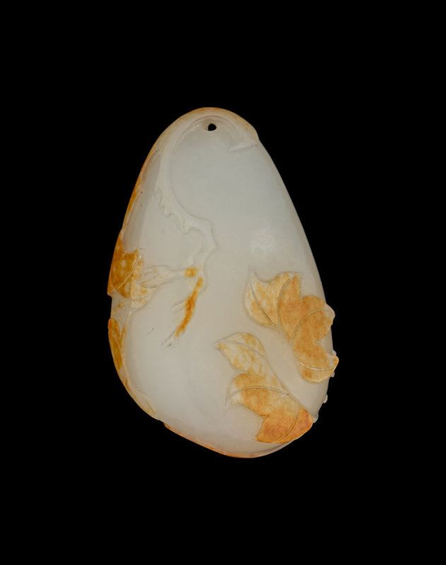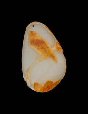 expertly carved in using the stone's two colors, the scene containing a songbird perched on a branch.