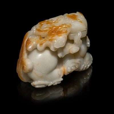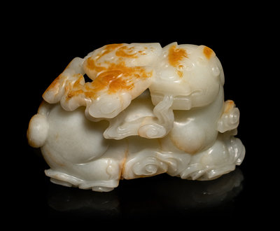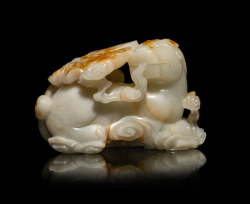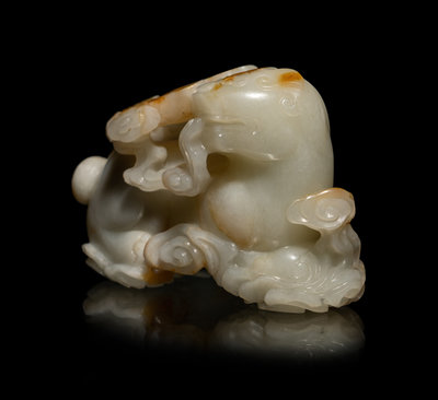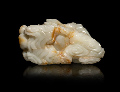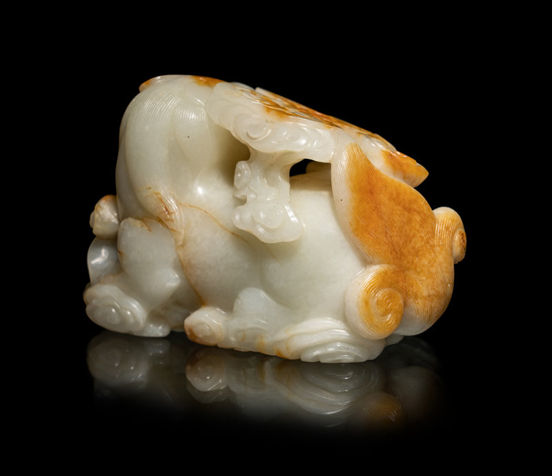 A Chinese Russet and White Jade Carving of a Mythical Beast