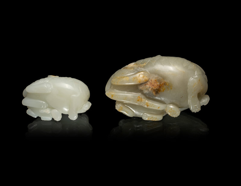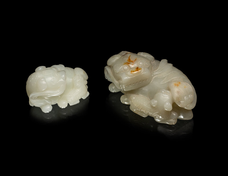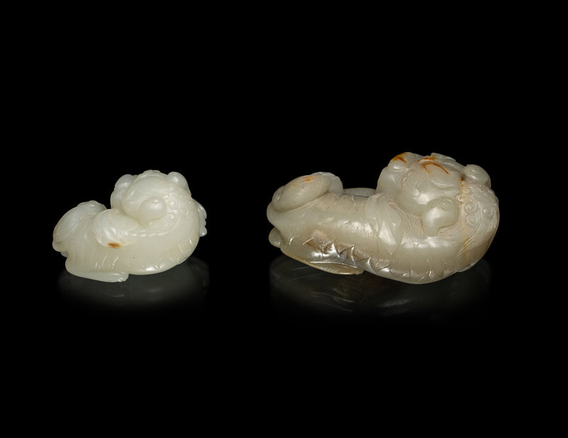 both depicting a big lion with a smaller lion, signifying the wish for a successful career, the larger of a greyish celadon stone with russet inclusions, the smaller of an even white tone.