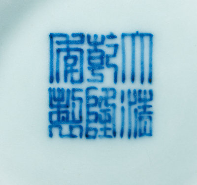 the hemispherical body resting atop a spreading foot, rising to an elongated, recessed neck and a galleried mouth, the main panel carved and molded with confronting kui dragons between a keyfret band and a row of overlapping leaves, similar motifs repeated on the neck, the foot decorated with ruyi heads, the underside bearing a Qianlong four-character mark in underglaze blue, set in a fitted hardwood stand.