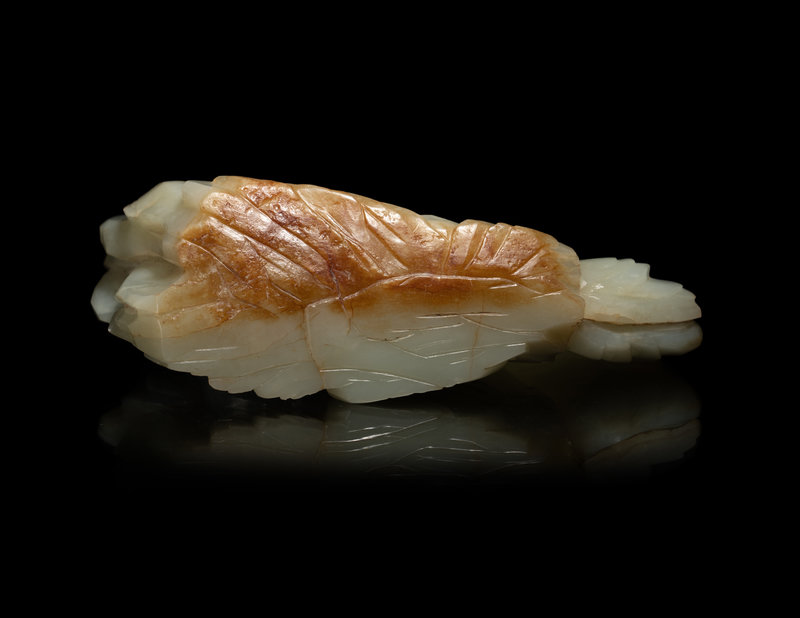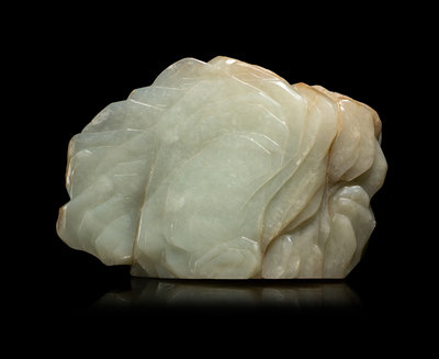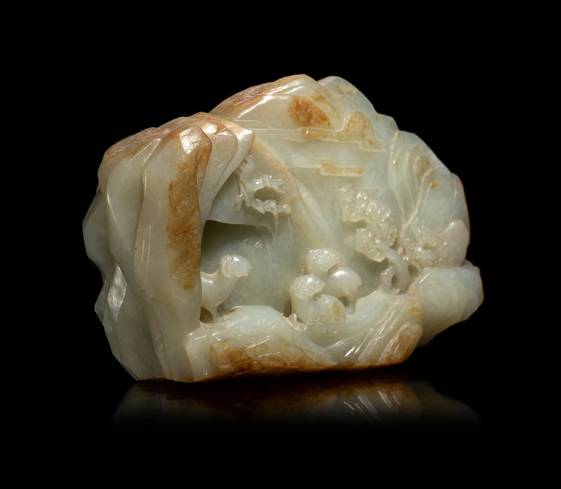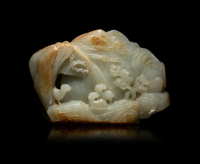 A Chinese Carved Russet and Pale Celadon Jade Boulder