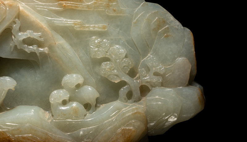 carved as a mountainous landscape with clouds, pine trees and a narrow pathway containing three rams, the stone of pale celadon color with russet inclusions throughout.