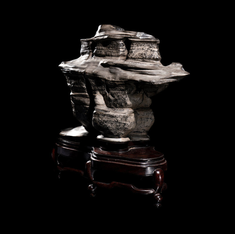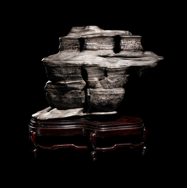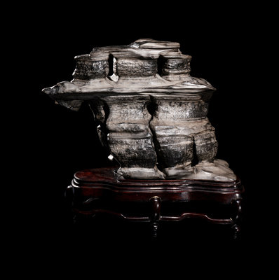 the horizontal stone having 'natural' layered formations surrounding various openings, raised on a fitted hardwood stand.