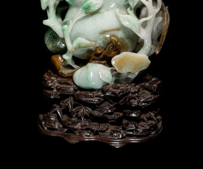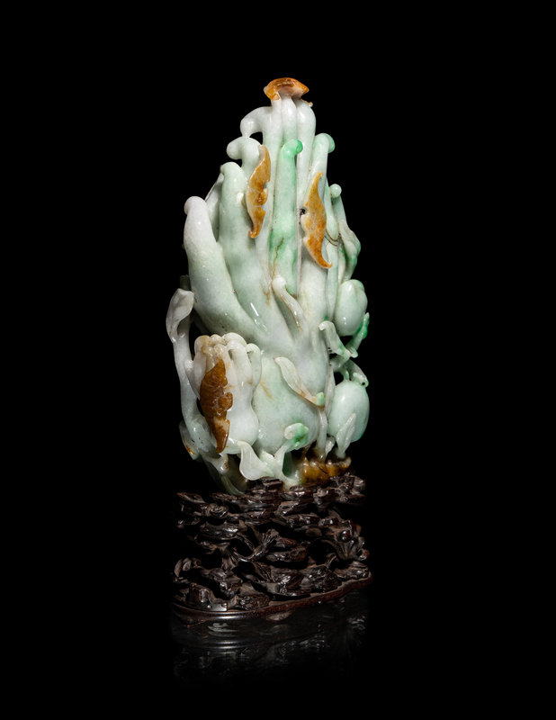 the large stone carved to depict the upright tendrils of the compressed fruit surrounded by ancillary fruits issuing from leafy vines, worked through russet skin showing soaring bats and lingzhi fungus, the whole risen above a reticulated hardwood stand carved with rockwork.