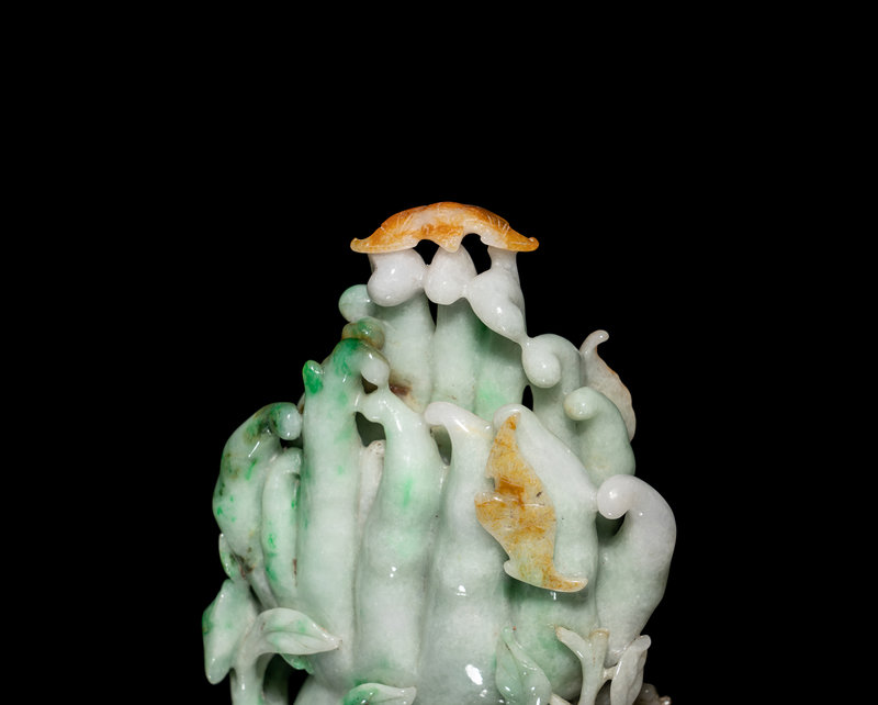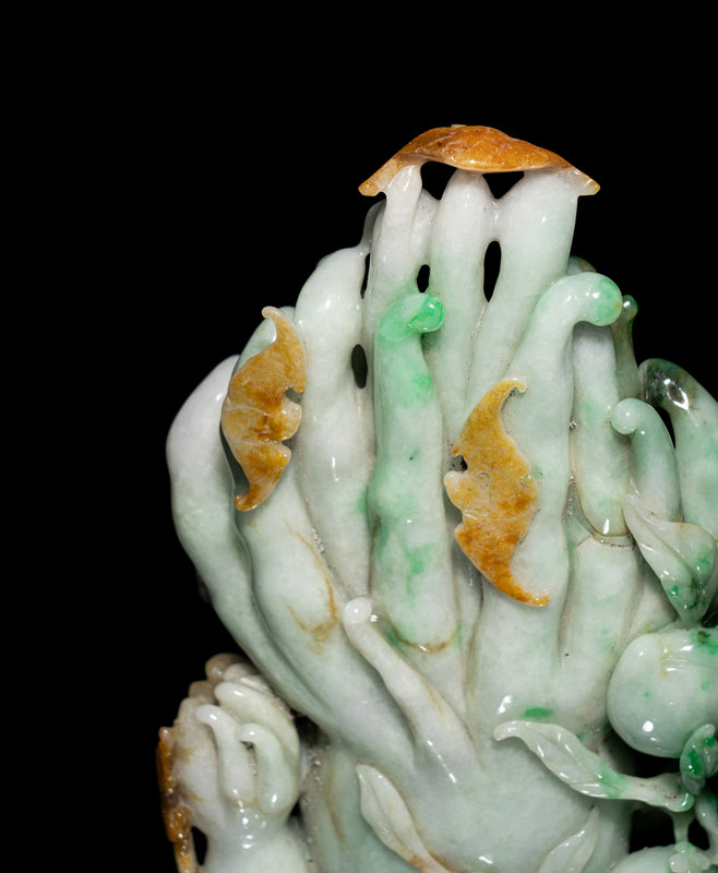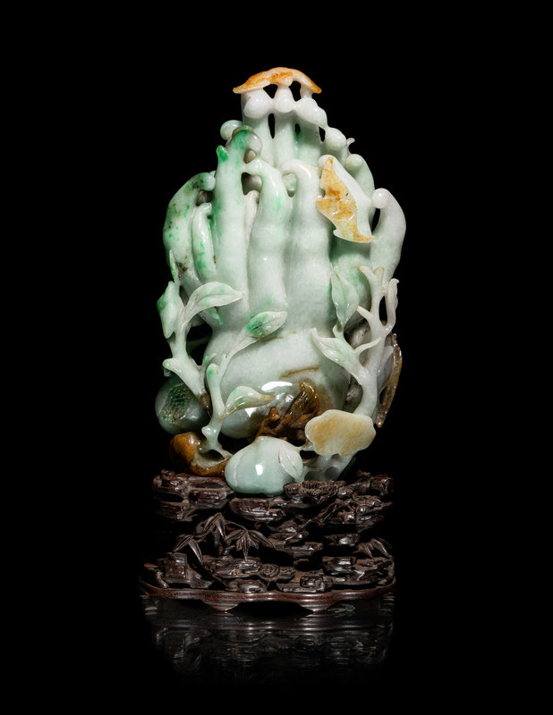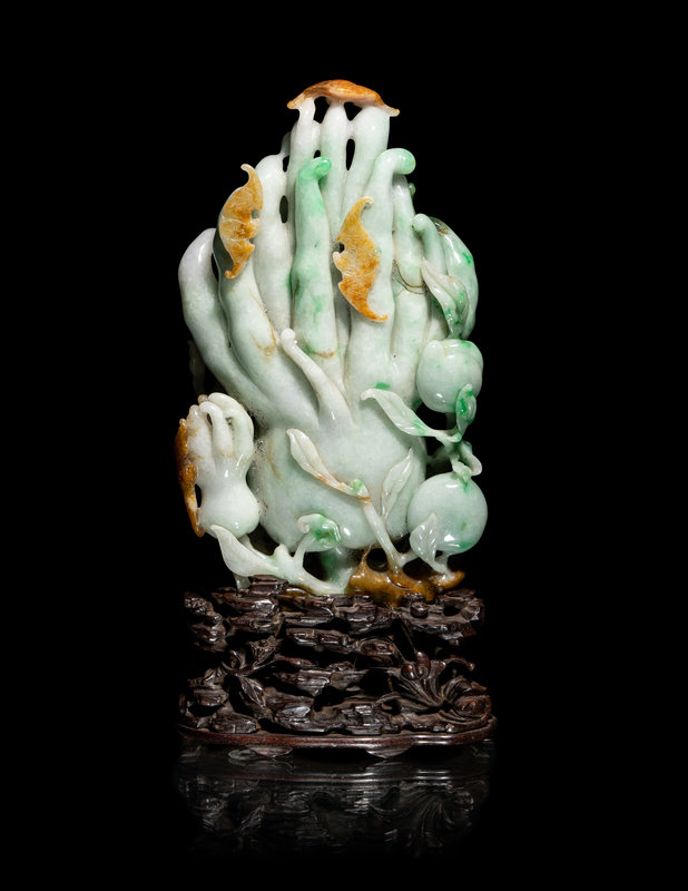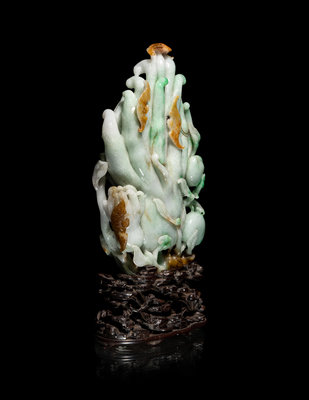 A Chinese Apple Green and Russet Jadeite Carving of Buddha's Hand Citron