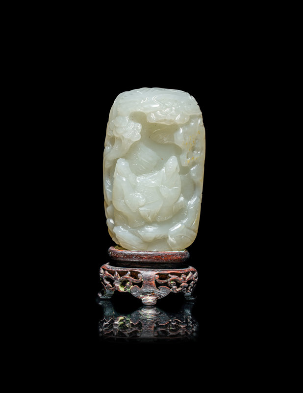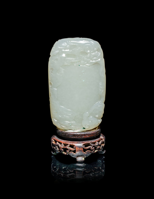 carved to the front in relief depicting two scholars playing go game in front of a pine grove, all below clusters of clouds, the stone of an even white tone, raised on a fitted carved hardwood stand.