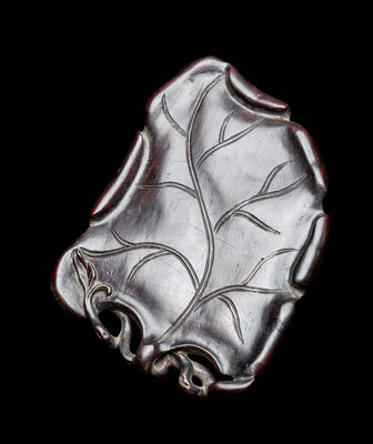 the large leaf-form palette carved to the sides in high relief showing two butterflies, lychee fruits issuing from intertwining gnarled branches, raised on a fitted leaf-form hardwood stand.