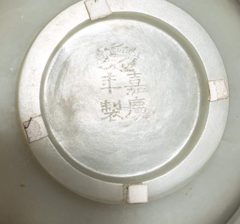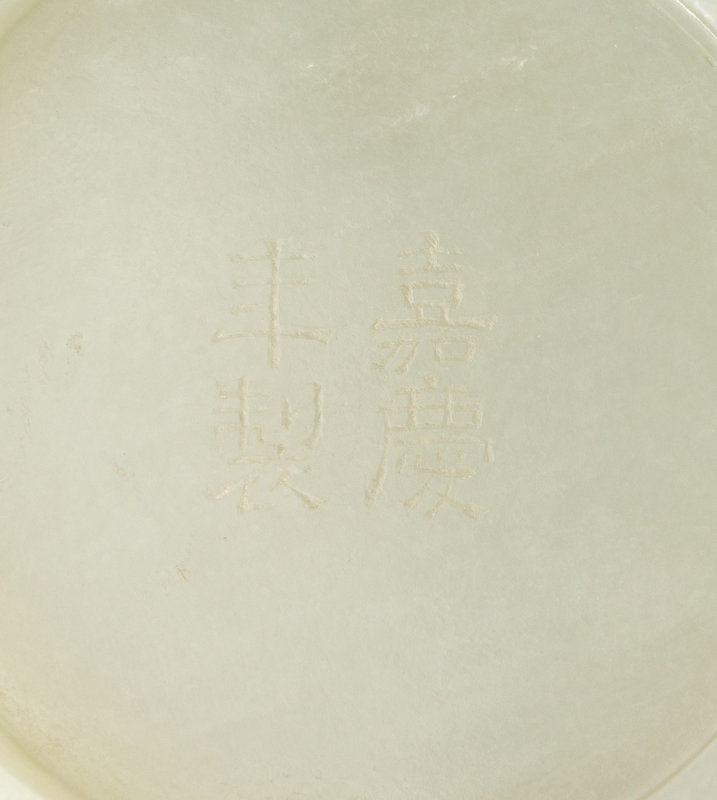 each with deep rounded sides supported on a neatly cut foot, elegantly rising to a gently flared rim, the polished stone of a pale celadon tone with white striations, the base engraved with a Jiaqing four-character reign mark.