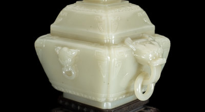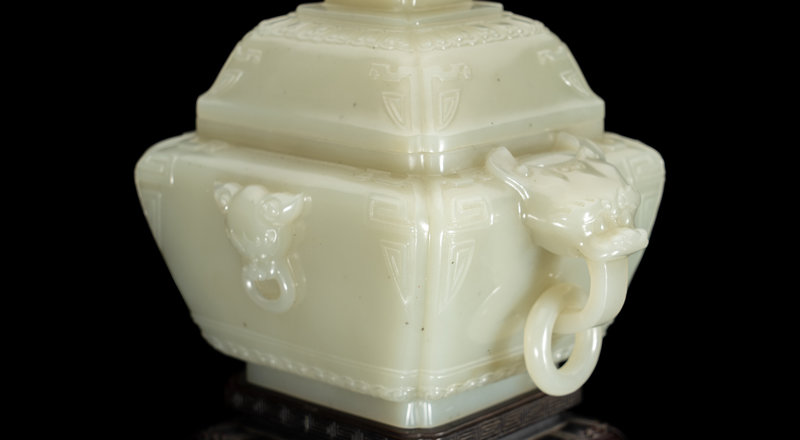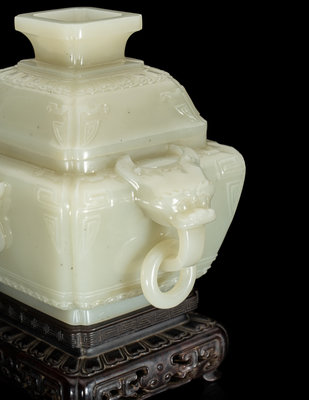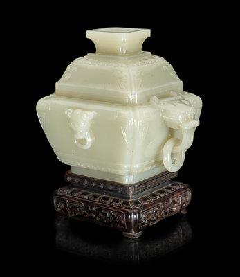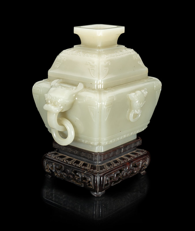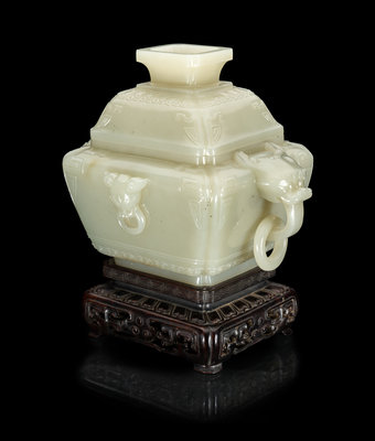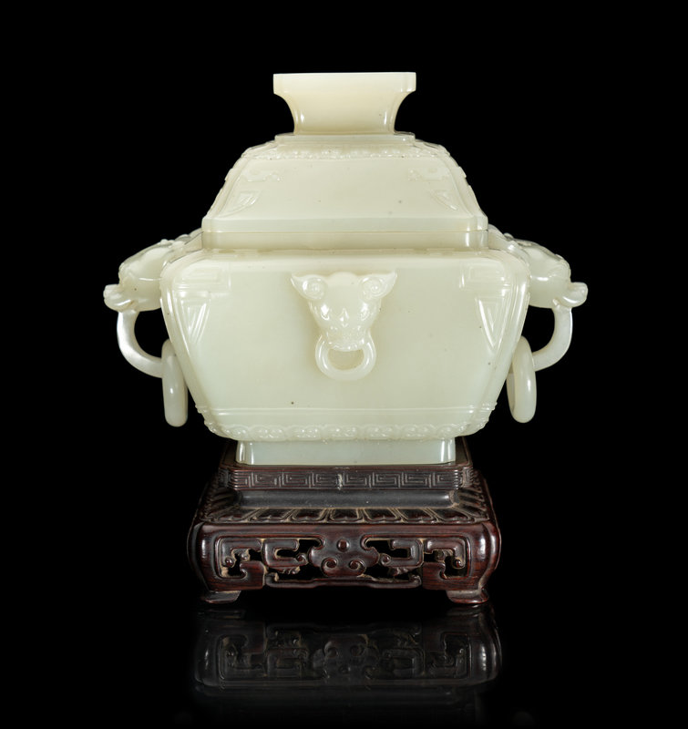 of rectangular form with rounded corners, flanked on each side with a mythical beast-head form handle with loose rings. The cover is carved with a band of archaistic scroll, the finial of rounded square form, raised on a fitted carved hardwood stand.