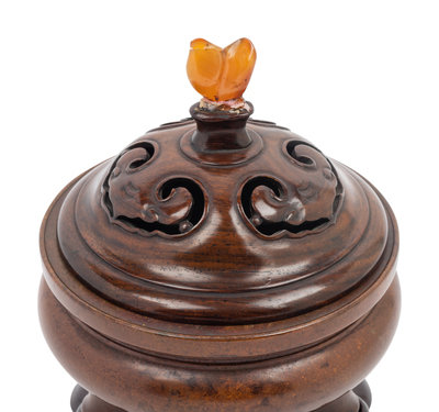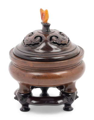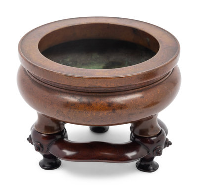 of bombé form with slightly flaring neck with everted rim and tripod feet, together with custom made wood cover and stand.